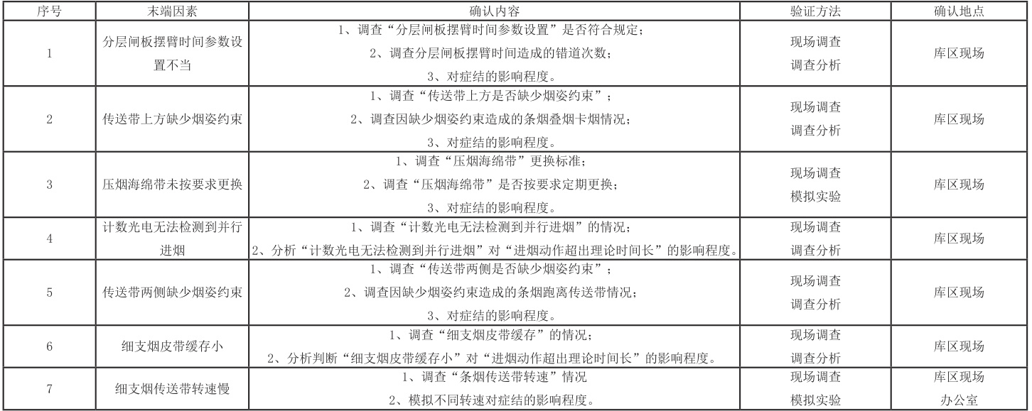 以问题为导向展开分析,确认“包装机单箱包装时间长”是制约分拣效率的核心瓶颈。通过人、机、料、法、环多方面排查,找出7 项末端因素,并确定“细支烟皮带缓存小”“计数光电无法检测到并行进烟”“传送带上方缺少烟姿约束”这3 个要因。坚持低碳、绿色、循环理念,自主创新对策,成功化解矛盾。
