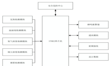 该方案的主要目的在于确保煤矿井下采掘区的安全监测。通过 STM32 单片 机作为系统核心,进行井下瓦斯、温度、湿度、氧气浓度和烟雾浓度的检测。地面安全监控中心根据井下分站传输的监测数据进行处理,并在必要时向相关分站发送指令,提醒井下人员尽快撤离。操作员可根据电脑清单发指令,电脑将数据显示于屏幕,包括实时监测、历史记录及发展趋势。系统结构如图2-1 所示。