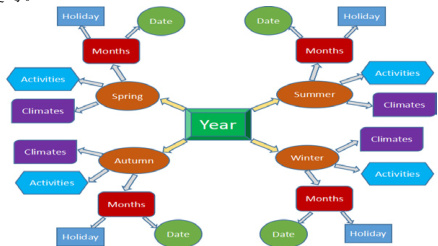 其次,在词汇的复习过程中,教师也可以利用思维导图的形式系统复习,这样不仅能有效得帮助学生系统的整理知识模块,还能帮助学生准确得抓住教学重点进行有效记忆,提高复习效率。传统的词汇复习课,无外乎是学生对着词汇表死记硬背,或是在练习本上做机械重复式的抄写,效果却不太理想。而思维导图对学生来说却是一种有效的复习方式。如在复习 pep 五下 unit2 My favourite season, Unit3 My school calendar 和 Unit4When is Easter 的时候我们就可以利用如下思维导图形式将这三个单元的知识点进行系统的整合复习。