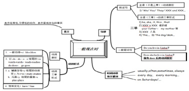 语法是构成英语的三大基本要素之一,是语言的支架,更是英语学习中不可缺少的一部分。语法知识的掌握是学生学好英语的关键 , 也是学生有效理解英语句子及文章的重要基础。而在英语教学过程中,传统的语法教学方式相对枯燥乏味,学生兴趣不高,容易造成学生学习中的疲惫感。教师可以利用思维导图将语法知识中的各个重要组成部分依次呈现,再逐个延伸讲解。这种将知识网状化的方式简单明了,学生一目了然,不但能激起学生的兴趣,更能便于学生记忆。如一般现在时的思维导图: