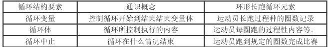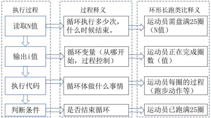 在for 循环主要构成中,主要包括有三种元素:循环变量,循环体,循环中止。本课程内容设计中采用“400m 环形跑道万米长跑”中所具备的要素类比循环结构中的各要素。