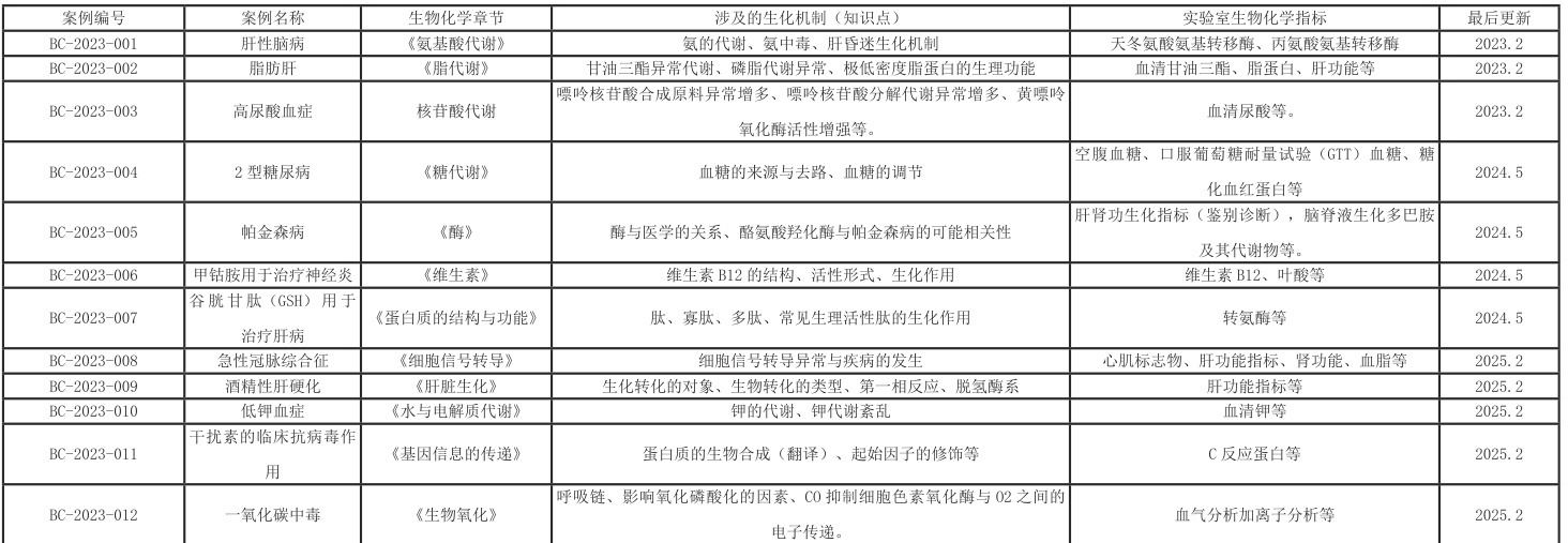 生物化学是医学教育中的核心基础课程,其内容抽象、知识密集,学生普遍反映学习难度大 [1]。传统的“填鸭式”教学方法难以满足新医学模式下对复合型医学人才的培养需求 [2]。随着信息化技术的发展和教育理念的更新,案例教学法(Case-Based Learning, CBL)和问题导向教学法(Problem-BasedLearning, PBL)逐渐成为生物化学教学改革的重要方向 [3-4]。然而,目前国内生物化学教学中病例资源分散、缺乏系统性,且信息化程度较低,严重制约了教学效果的提升[5]。