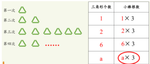 实践探究活动能够让学生在实践动手操作中实现数学知识的迁移和转化,从而有效培养学生的主观能动性以及在操作活动中的协同精神。在用字母表示数的这堂课程中,教育工作者也可以引入实践操作类的环节,让学生通过动手摆三角形感受代数关系。