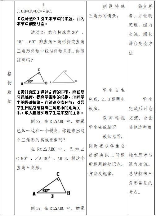 本节课依据新课标的要求,设计的每个环节都是以学生为主体,在学生已有的知识经验的基础上,让学生自己动手探究完成,以便提高学生的探索创新思维和创造能力。首先,从定理的证明引入,提出问题,让学生猜想直角三角形应具有的性质,调动学生的思维积极性,激发探究欲望。