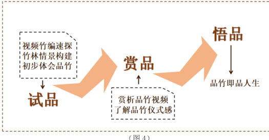 如在《竹》美术课堂中,深入环节采用梯度分层引共鸣的设计:通过竹编速探、情景构建、视频欣赏营造品竹氛围,以第一层试品、第二层赏品、第三层悟品的梯度,让学生体悟品竹的仪式感、精神内涵以及品竹即品人生的精神追求。在实施过程中,针对不同层次学生给予个性化指导,对于基础较弱的学生,重点引导观察竹编的基本结构和工艺特点,如观察竹篮的编织纹路是十字交叉还是人字纹,鼓励他们用简单的线条记录下来;对于有一定基础的学生,鼓励其尝试创新竹编造型或结合其他材料进行创作,如将竹编与彩绳相结合,创作出具有现代感的挂饰作品;对于能力较强的学生,引导深入挖掘竹文化内涵,在作品中体现独特的文化感悟,如创作以“竹与禅意”为主题的竹雕作品,通过细腻的雕刻展现竹子在传统文化中与禅意的相通之处。对比不同教学阶段学生表现,初期基础较弱学生可能对竹编结构观察不够细致,随着教学推进,在教师针对性指导下,他们能够更准确把握竹编特点;有一定基础学生在创新创作方面,从初期模仿到后期逐渐形成自己的风格;能力较强学生对竹文化内涵的挖掘也不断深入,作品的文化表达更加深刻。通过对比分析,教师可动态调整教学内容和方法,以适应学生不断发展的学习需求。(图4)