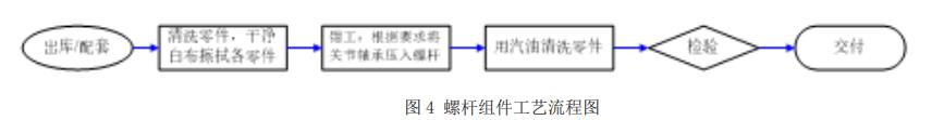 下图 4 为螺杆组件加工工艺流程图,螺杆组件加工过程中可分为配套出库、检查轴承的灵活性、压装及收口、清洗检验等步骤,具体如下。