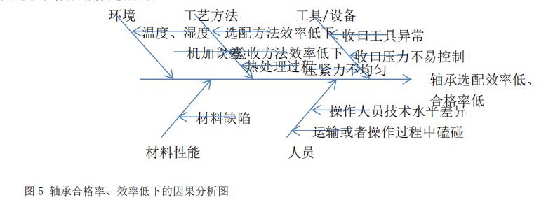 从人员、工具设备、工艺方法、材料性能、环境等角度分析,认为零件螺杆材料、环境两项对轴承工作影响轻微,可暂时忽略。影响零件螺杆压合效率低、不合格率高的主要因素在于工艺方法、工具设备,人员操作,下图 5 为因果分析图。现从工艺方法、工具设备及人员操作的角度进行分析。