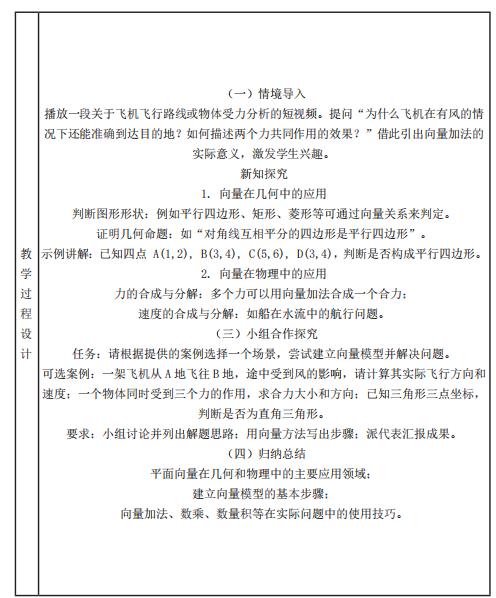 可选案例:一架飞机从A 地飞往B 地,途中受到风的影响,请计算其实际飞行方向和速度;一个物体同时受到三个力的作用,求合力大小和方向;已知三角形三点坐标,判断是否为直角三角形。
