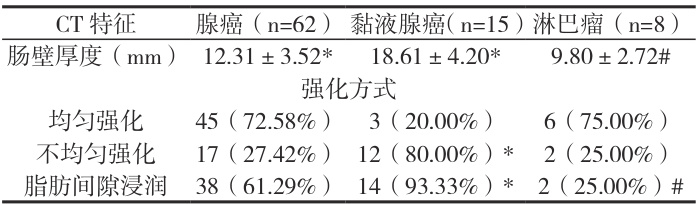 黏液腺癌肠壁厚度显著增加( P<0.05 ),淋巴瘤以均匀强化为主,见表2。