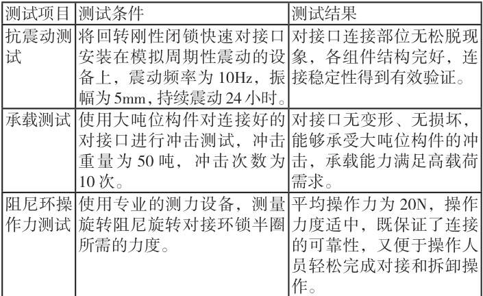 通过以上测试数据可以看出,回转刚性闭锁快速对接口在抗震动性能、承载能力和操作便捷性方面均表现出色,能够满足高载荷模块化机具的实际使用需求。