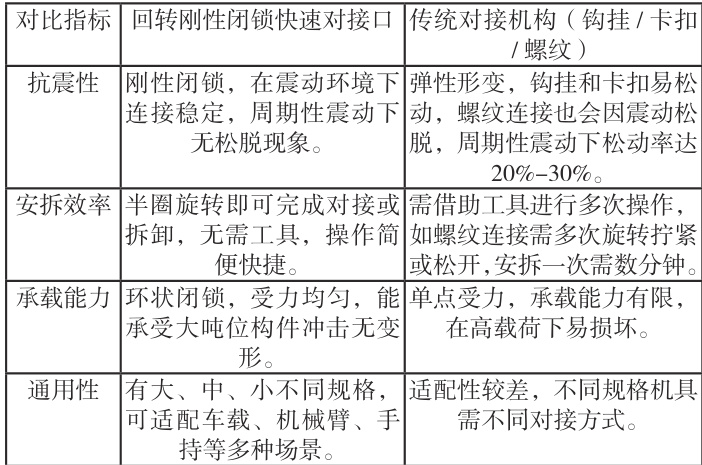 回转刚性闭锁快速对接口在抗震性、安拆效率、承载能力和通用性方面均优于传统对接机构,能更好地满足高载荷模块化机具的使用需求。
