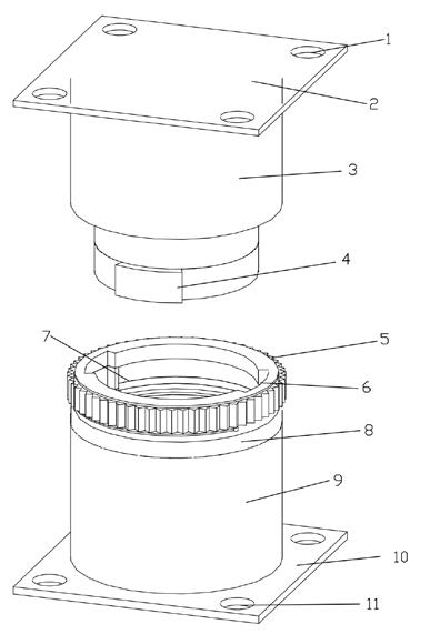 核心组件包括三部分:前端对接头采用高强度合金钢笋耳结构( 80×30×20mm ),确保稳定插入和承载;阻尼旋转对接环锁由 L形锁槽( 25×32mm )、滑动旋转环( Φ150/120mm )和阻尼环组成,通过精密调校的阻尼系数实现顺畅旋转与可靠锁定;后端转换底座配备 Φ200mm 脚盘,带4 个 Φ 18mm 螺栓孔,实现模块化快速安装。所有组件均采用实心厚块金属制造,在保证高载荷稳定性的同时,兼顾操作便捷性和抗震性能,满足频繁拆装需求。