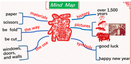 语言建构,为项目的实施提供语言基础,扩充其相关语料库。深入阅读语篇,通过阅读与优秀传统文化相遇,在赏析中学习语言,理解文化。在《Beauty In Common》中利用思维导图,将语篇结构可视化,引领学生进行学习理解类活动。即通过获取与梳理,概括与整合,帮助学生在积累语料库的同时,对孔明灯,剪纸和泥人三种中国传统工艺的材料,历史,工艺和文化意义有了清晰的了解。进而帮助学生掌握语篇结构,即形成结构化知识。对于下一步的项目实施提供了文本的结构化支持。思维导图的应用对于学生最终成果的形成起到了重要的支架作用。