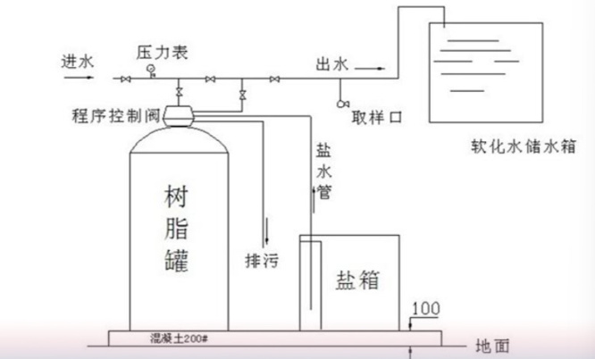 离子交换树脂法(如图1 所示)是工业锅炉锅外软化水处理的主流技术,该方法利用离子交换树脂的特性,其内部含有可交换的离子,当含有钙、镁离子的原水通过装有阳离子交换树脂的交换器时,钙、镁离子会与树脂中的钠离子发生交换反应,从而被树脂吸附,促使原水硬度降低。这样不仅能够减少锅炉内部结垢现象,而且还能够提高热传递效率,以此来降低燃料消耗。离子交换树脂在使用一段时间后会饱和,失去交换能力,此时需要进行再生处理 [1]。通常利用食盐作为再生剂,再生剂中的钠离子会将树脂吸附的钙、镁离子置换出来,促使树脂逐渐恢复交换能力,以便循环使用。该类型操作方法相对简便,软化效果也比较明显,但是其存在再生剂消耗以及再生废水处理的问题,所以需要配套相应的废水处理设施才能够达到良好的效果。