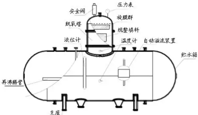 热力除氧法主要是根据气 的原 ,将水加热至沸点,促使水中的溶解氧等气体逸出。在工业锅炉系 器水箱,紧接着通过蒸汽加热至沸腾状态,蒸汽与水充分 排气口排出。为增强除氧效果,除氧器内常设置填料层, 以 热力除氧法除氧效果良好,所以能够降低水中溶解氧[3]。但是需要 需要消耗大量蒸汽,对设备密封性要求也较为严格,避免外界空气进入影响除氧效果(如图2 所示)