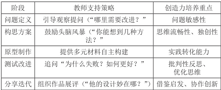 “明确问题→构思方案→制作原型→测试优化→分享改进”的闭环流程,培养系统性创造思维: