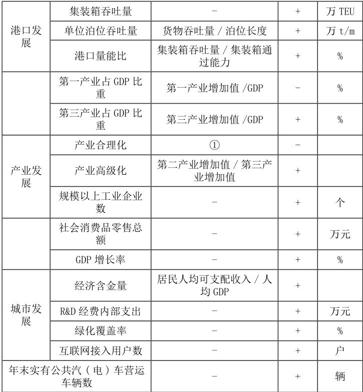 如前文所述,高质量发展时期关注经济发展活力、效率、质量和民生等全面发展。本文借鉴国内外研究成果,基于科学性、全面性与可操作性等原则,参考相关评价指标,构建了高质量发展视域下港产城融合水平评价指标体系,具体如表1 所示。