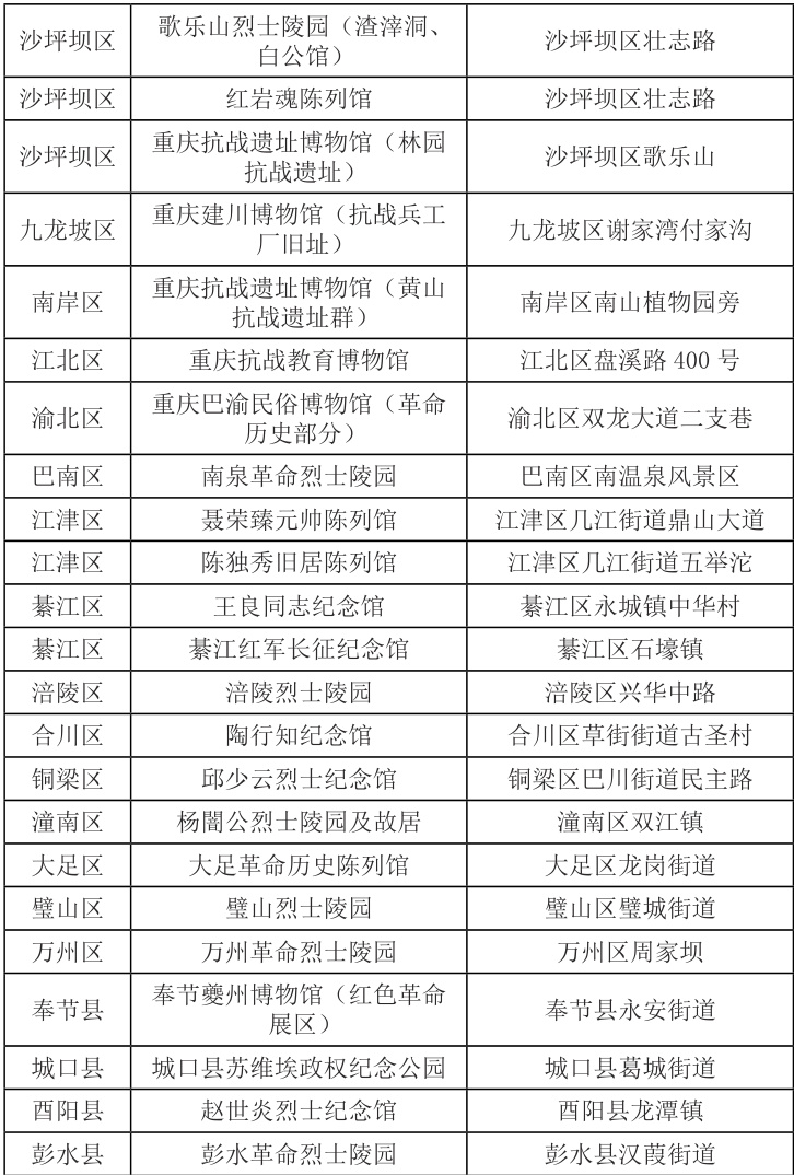 新中国成立以来,重庆各区县共建成28个红色场馆,主要是革命纪念馆、陵园等,突出革命先进文化主题教育,供重庆主城和各区县的大中小学对学生开展红色文化教育使用。主要场馆见表1
