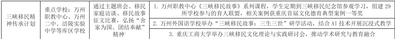 2005 年重庆市委、市政府正式将红岩精神和三峡移民精神确立为重庆的两大代表性精神。近年来重庆各大中小学围绕两大精神结合本地红色文化资源,构建课程体系,开展了丰富多彩的红色文化教育实践,打造了一批红色文化德育品牌。其中《红岩精神引领下的“大思政课”实践路径研究》重庆市教科院,2023年市级重点课题)与《三峡移民精神融入中小学德育的校本化探索》(万州区教委)两个课题获全国德育创新案例奖。