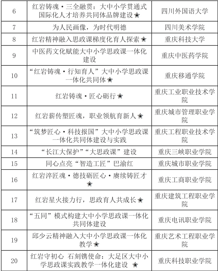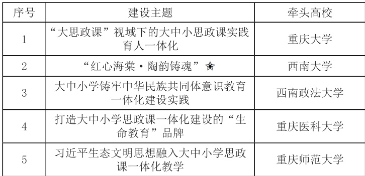 2023年5月,重庆市教委确定首批25个大中小学思政课一体化建设共同体名单,其中重点共同体10个,试点共同体15个。10个重点共同体分别由西南政法大学、重庆医科大学、重庆师范大学、重庆交通大学、四川外国语大学、重庆理工大学、重庆三峡学院、重庆第二师范学院、重庆对外经济贸易学院、重庆城市管理职业学院牵头;15个试点共同体分别由重庆邮电大学、重庆工商大学、四川美术学院、重庆文理学院、长江师范学院、重庆工程学院、重庆财经学院、重庆电力高等专科学校、重庆医药高等专科学校、重庆电子工程职业学院、重庆工程职业技术学院、重庆工业职业技术学院、重庆化工职业学院、重庆科技职业学院、重庆三峡职业学院。