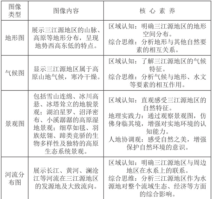 “高原湿地——三江源地区”图像资源及对应的核心素养分析表