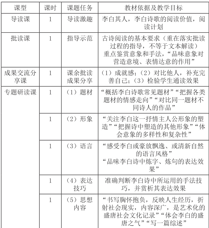 第二,设计一组课型,给学生提供详细的诗歌沉浸式阅读范例。将李白诗歌沉浸式阅读教学分成 4 个课型:导读激趣课,批读指导课,批读成果交流分享课,专题研读指导课,4 个课型共计 8 个课时。每一课型就是一个支点,学生通过这些支点可以形成诗歌阅读框架。