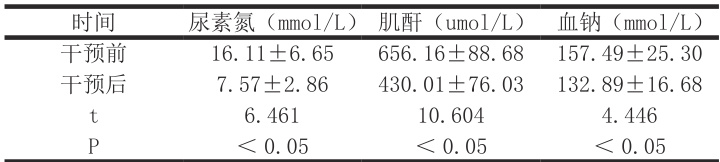 干预后患者尿素氮、肌酐及血钠水平低于干预前,差异明显( ⋅P<0.05) 。具体数据见下表。