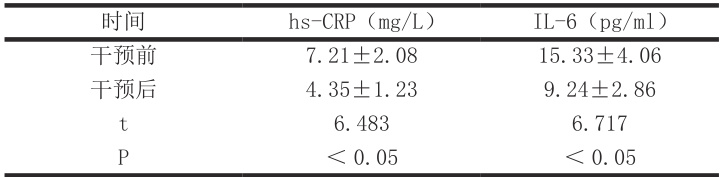 预后患者hs-CRP、IL-6 水平低于干预前,差异明显 (P<0.05 )。具体数据见下表注:hs-CRP :超敏C 反应蛋白;IL-6 :白细胞介素-6。