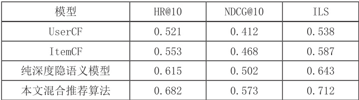 与标准 UserCF、ItemCF 和纯深度隐语义模型相比,本研究提出的混合推荐算法在 HR@10、NDCG@10 以及 ILS(Interest Location Score)等指标上均取得优势。以下是性能对比的表格数据示例。