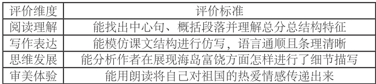 教师教《富饶的西沙群岛》这一课时,其教学目标重在让学生在学习中,理解课文架构并学会其中的描写发挥,同时还要通过作者字里行间的描述体会其传递的情感等。结合这方面素养目标看,评价标准的制定可参考表 1。以其中的写作表达及其评价标准为例来进一步分析,教师对于《富饶的西沙群岛》这节课的教学,可设计“我眼中的美丽海岛”这一写作任务。对学生写作的评价中,标准应涵盖是否使用了总分总结构与恰当的形容词、是否在写作中融入了自己对海岛的了解和情感等。这种评价标准的制定更引领学生明确自己的写作方向,还可为教师针对性进行评价、指导提供便利作用。