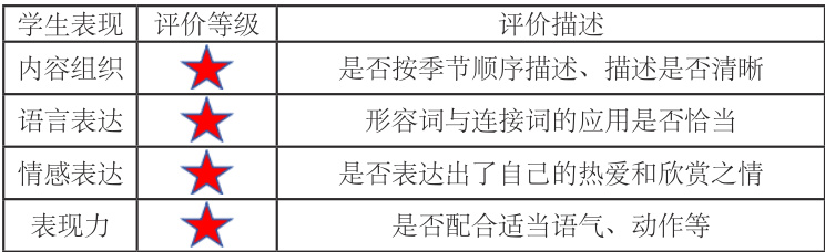 《美丽的小兴安岭》是一篇描写四季变化的文章,且学生对四季的变化也较为熟悉,教师教学中可摒弃以往板书式、按部就班的教学方式,可以设计“四季小导游”的活动,为学生积极参与课堂的学习奠定基础。结合该活动教师设计评价量表时,可参考表 2,而聚焦学生活动情况依据评价量表进行表现性评价时,教师可安排学生分组就各季节景色进行介绍,而教师则可结合量表来采取现场点评的方式评价学生的表现,进而基于评价提供给学生具体的反馈与指导。这既能促进学生语文能力的提高,而且学生表达自信、合作意识也可从中得到增强。