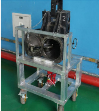 本研究设计并制造了一种可移动式过渡车钩搬运平台(如图所示),其核心结构与功能如下:移动装置,平台底部安装4 个12 英寸万向轮,确保在平整地面灵活移动。特别设计了可承重 100kg 的复合材料辅助过轨板,解决平台跨越库内钢轨的难题。放置平台:作为承载过渡车钩的主体,采用高强度铝合金框架结构,保证强度同时减轻自重。平台表面开设有精确匹配过渡车钩轮廓的定制化卡槽,确保车钩放置稳定、贴合紧密。高度调节装置,集成手动千斤顶机构于放置平台下方,可灵活调节平台工作高度。该设计有效解决了不同线路工程车车钩高度存在差异的问题。加固装置,采用铁链条与快速卡扣相结合的方式,在搬运过程中对放置在卡槽内的过渡车钩进行可靠固定,防止意外滑落。