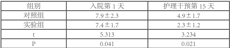 通过对不同研究对象的疼痛严重程度进行对比可以发现,在入院时,由于临床症状的影响,两组研究对象的疼痛都比较严重,且不存在明显差距。而在进行了15 天的护理干预后,两组患者的疼痛都得到了比较明显的缓解。在本文中,针对个性化疼痛护理的作用机制进行研究可以发现,首先,个性化疼痛护理的具体措施需要根据患者的具体病情和疼痛严重程度进行完善和调整。因此,其在缓解患者疼痛方面能够取得相对较好的效果 [7]。其次,针对患者的疼痛问题,个性化疼痛护理干预中实施的疼痛护理方法更加多元化,因而能够根据患者的病情新选择最佳的疼痛护理方式,同时也能够在最大程度上发挥各种疼痛护理干预措施的作用[8]。因此,个性化疼痛护理模式在急性肾结石患者中具有应用价值。