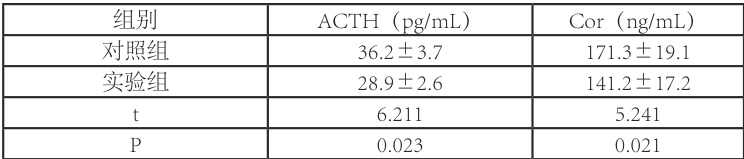 本文的观察指标为疼痛评分以及 ACTH(促肾上腺皮质激素:对下丘脑及垂体前叶起着长负反馈作用)、Cor(皮质醇)指标。其中,疼痛评分最高值为 10 分,分值与疼痛严重程度成正比。ACTH、Cor 数值的大小与患者生理应激反应的严重程度成正比。