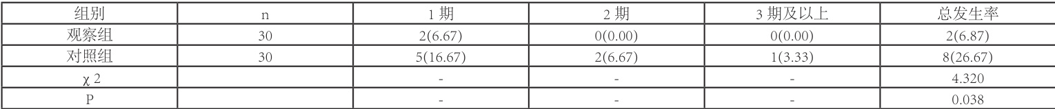 观察组的压力性损伤总发生率 6.67% ,低于对照组的 26.67% ( Φ.<0.05) ),见表1。