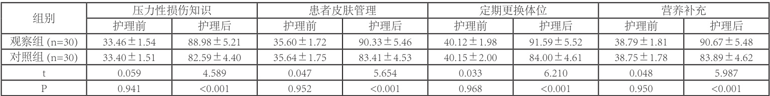 护理前两组患者家属的压力性损伤认知评分无差异( P>0.05) ),护理后高于护理前且观察组高于对照组( ⋅p<0.05 ),见表2。