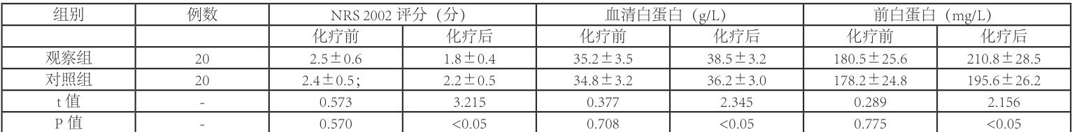 化疗后,观察组患者的 NRS 2002 评分低于对照组,血清白蛋白、前白蛋白水平高于对照组(P<0.05),见表1。