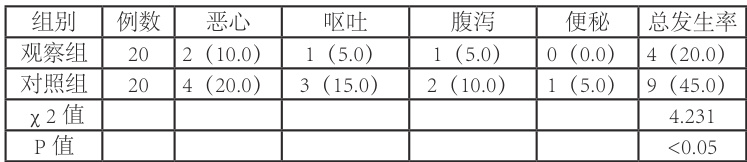 观察组患者化疗不良反应发生率为 20.0% ,低于对照组的 45.0% ( (P<0.05) ),见表2。