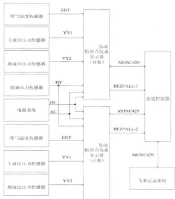 发动机组合仪表显示器采集来自热电偶式传感器、滑油压力传感器、主液压和助液压传感器,以及飞机电源系统的交、直流电压等输入信号,经处理后,在显示板上显示排气温度、滑油压力、主液压压力、助液压压力、交流电压、直流电压,同时具有自检测和亮度调节功能,根据检测结果,输出故障离散信号。余度控制器接收来自前、后座舱显示器所采集的信号,并将所接收的信号采用 ARINC429 再传输给前、后座舱发动机组合仪表显示器与飞行参数记录仪,同时给滑油压力传感器提供激励电压,并设置热电偶式传感器组别状态输出给发动机组合仪表显示器。热电偶式传感器感受发动机排气温度转换为与之成正比的热电势输出给发动机组合仪表显示器;滑油压力传感器用于测量发动机滑油系统内的滑油压力,并将其转变为交流电信号传送给发动机组合仪表显示器;主、助液压系统压力传感器用来测量飞机主、助液压系统内的液压压力,并将其转变为直流电信号传送给发动机组合仪表显示器。