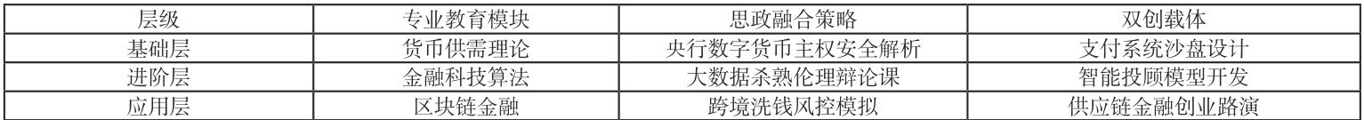 横向按 “基础层 - 进阶层 - 应用层” 递进,纵向每单元嵌入专业、思政、双创三重目标(见表 2-1)。例如 “区块链金融” 单元中,专业目标聚焦技术应用,思政目标侧重跨境洗钱风控伦理,双创目标指向供应链金融路演,三者通过知识图谱节点动态关联。