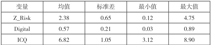 表 1 显示,Z_Risk 均值为 2.38(标准差 0.65),Digital 均值为 0.57(标准差0.21),样本间数字化水平差异显著。