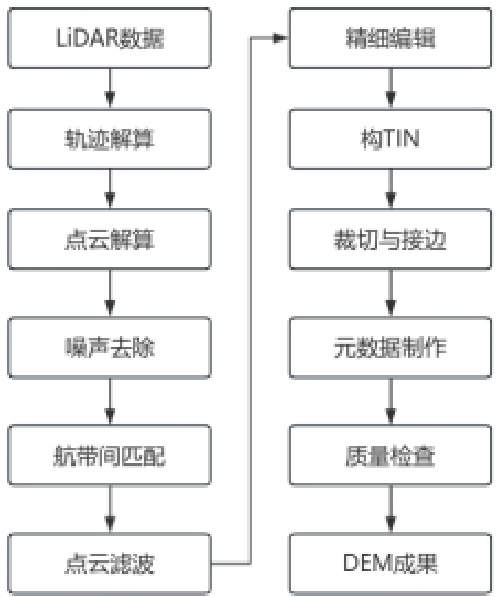 DEM 基于LiDAR 点云数据,通过点云解算、点云滤波等各种方式,最终生成DEM,技术流程如图 2 所示。