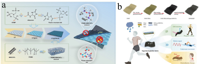 图1 (a) 阻燃智能纺织品制作流程 (b) 超疏水电子织物的制造流程及潜在应用。