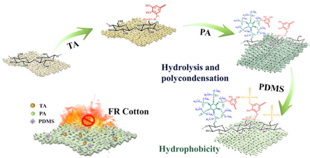 疏水织物具有自清洁、防污、防水、防霜冻等重要功能。LbL 技术通过构建微纳粗糙结构和引入低表面能物质,是实现织物表面疏水改性的有力手段。通过层层组装法能够使得疏水层可以方便地组装在已具备导电或阻燃功能的LbL 涂层之上,实现多功能叠加。如图 2 所示:利用绿色天然材料单宁酸(TA)、植酸(PA)和聚二甲基硅氧烷(PDMS)的组合,采用层层组装法(LBL)在棉织物上构建了一种环保、高效的疏水阻燃涂层。