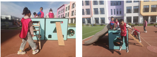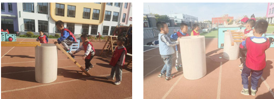 挑战区的材料都是一些大型器械,比较重,幼儿在搬运、跳跃的过程中如果出现推挤的情况就会发生安全问题。在这段时间游戏的观察过程中我发现有个别幼儿幼儿在箱子上推人、在搬运时不按顺序挤作一团或者突然松手的问题,这些安全问题有的是因为幼儿本身对材料的操作不当造成的,有的是因为幼儿缺乏规则意识。这就启发我们在活动开始前或者每次游戏结束时结合图片、视频等组织幼儿讨论需要注意的安全问题,让幼儿知道哪些行为是不能做的。安吉游戏虽说放手,但不是对于安全问题不管不顾,在保证幼儿安全的前提下,才能让孩子们更好的游戏。