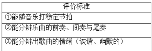 针对初学者,标准侧重 “能否完成基本任务”,如 “能跟随录音演唱歌曲,节奏基本准确”“能识别常见乐器的音色”。如一年级学生学习《小花猫和小老鼠》,评价标准如图:能够达成这三项即为合格。(如图2)