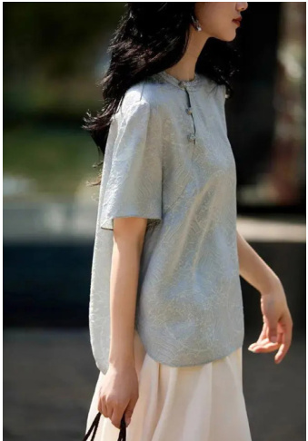 以中华美学思想为基础的针织服装设计的本质特征就是创造一种超越具有形象表征意义的意境表达理念。这个设计理念要表达的是不拘泥于具像事物的形式上简单复制,而应着眼于捕捉并传递到它内在的精神气韵、所处的环境氛围还有整体审美意象,利用针织工艺的特定材料性质,通过对纱线色彩渐变过渡、多种不同材质的混合配搭、织物厚度精细把控、采用镂空设计结构来在面料表面营造出好似水墨挥洒而出时的那种晕染扩散的效果,并且创造出能带给观者视觉和触觉两方面美好感受的整体氛围艺术感受,对传统装饰元素如云纹、 服装设计当中,水纹常常借助简化、变形或者抽象化等手段加以艺术化处理,着重表现其内在精神意义,并不是拘泥于原本模样,这种设计理念想要依靠服装同人体的互动,促使观众联想到自然风景、诗情画意以及深层哲学思索,从而超越传统服饰的功能性束缚,变成兼具文化内涵和审美价值的艺术存在。图 1 中,冰蓝色面料通过经纬提花工艺织出海浪暗纹,远看如青瓷釉色晕染,近观可见波浪纹理起伏,模仿水墨在织物上的流动感。斜襟盘扣设计简化传统结构,突出空灵山水意境。