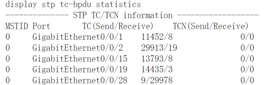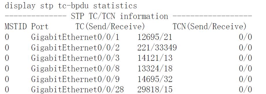 为了确认出现大量的 TC 报文的问题是怎么产生的,得先确定 TC 报文是从哪台设备产生的。通过 displaystp tc-bpdu statistics 命令,根据拓扑结构,逐层排查 TC 报文的入方向设备,检查报文是在网络中的哪一台设备上产生的。
