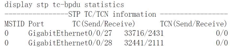 在SW4 上查询,发现只有端口27 和28 Send 方向有大量的TC 报文增长,其他端口并没有接收和发送TC 报文,从检查的情况来看,TC 报文应该主要来源于部门B 的SW4。