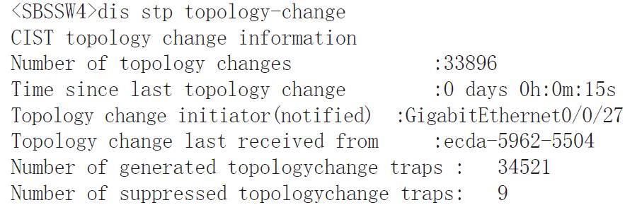 在 SW4 上执行命令 display stp topology-change 查询该 TC 报文的信息,通过以下信息,我们可以看到收到拓扑变化报文而触发拓扑变化的端口主要是端口27。